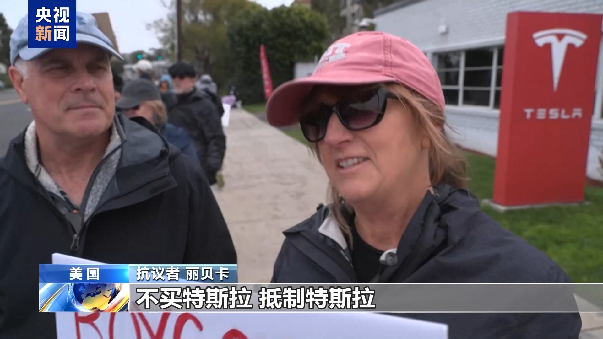 抗议者 丽贝卡:我在这里抗议,是因为埃隆·马斯克正在一点点地、非法地、违宪地摧毁美国政府,所以我们在这里抗议。不买特斯拉,抵制特斯拉,不支持马斯克。